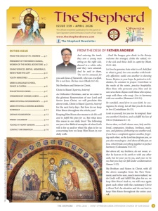 1 THE SHEPHERD • APRIL 2026 • SAINT SPYRIDON GREEK ORTHODOX CHURCH OF SAN DIEGO www.theshepherdnews.com The Shepherd Newsletter The official newsletter publication for the parish of Saint Spyridon Greek Orthodox Church of San Diego I S S U E 3 5 9 • A P R I L 2 0 2 6 IN THIS ISSUE FROM THE DESK OF FR. ANDREW ...... p. 1 PRESIDENT OF THE PARISH COUNCIL, WOMEN OF THE WORD, BOOKSTORE .p. 2 DIVINE SERVICES, BIRTHS, MEMORIALS, NEWS FROM THE LOFT .......................... p. 3 YOUTH MINISTRIES ................................. p. 4 GREEK LANGUAGE SCHOOL, DANCE & CHORAL .................................. p. 6 PHILOPTOCHOS NEWS .......................... p. 7 STEWARDSHIP CORNER, AHEPA ......... p. 8 GREEK FESTIVAL SPONSORSHIPS ....... p. 9 GREEK FESTIVAL COOKING & BAKING SCHEDULE ................................................. p. 11 ZATHAS FOUNDATION ......................... p. 12 PARISH CALENDAR ................................ p. 14 YOUNG AT HEART SENIORS ................. p. 15 CONTACT INFORMATION....................... p. 16 FROM THE DESK OF FATHER ANDREW And entering the tomb, they saw a young man sitting on the right side, dressed in a white robe; and they were amazed. And he said to them, “Do not be amazed; for you seek Jesus of Nazareth, who was crucified, He is not here, He has risen (Mark 16:5-6). My Brothers and Sisters in Christ, Christ is Risen! Χριστός Ανέστη! As Orthodox Christians, and as we come to the glorious Resurrection of our Lord and Savior Jesus Christ, we will proclaim this above truth, Christ is Risen! Χριστός Ανέστη! for the next forty days. But how do we keep Him Risen throughout the whole year? Keeping Him Risen also means to do His will and to fulfill His plan for us. But what does this mean in our daily lives? The following are just a few Biblical examples of what God’s will is for us and/or what His plan is for us concerning how we keep Him Risen in our daily walk: …Feed the hungry, give drink to the thirsty, welcome the stranger, clothe the naked, vis- it the sick and those held in captivity (Matt. 25:31-46). Let love be genuine; hate what is evil, hold fast to what is good; love one another with broth- erly affection; outdo one another in showing honor. Rejoice in your hope, be patient in trib- ulation, be constant in prayer. Contribute to the needs of the saints, practice hospitality. Bless those who persecute you; bless and do not curse them. Rejoice with those who rejoice, weep with those who weep. Live in harmony with one another (Romans 12:9-21). Be watchful, stand firm in your faith, be cou- rageous, be strong. Let all that you do be done in love (Corinthians 16:13). Look to yourself, lest you too be tempted. Bear one another’s burdens, and so fulfill the law of Christ (Galatians 6:1-2). Put on then, as God’s chosen ones, holy and be- loved, compassion, kindness, lowliness, meek- ness, and patience, forbearing one another and, if one has a complaint against another, forgiv- ing each other; as the Lord has forgiven you, so you also must forgive. And above all this put-on love, which binds everything together in perfect harmony (Colossians 3:12-17). But above all, my brethren, do not swear, ei- ther by heaven or by earth or with any other oath, but let your yes be yes, and your no be no, that you may not fall under condemnation (James 5:12). My Brothers and Sisters in Christ, with all the above examples from the New Testa- ment, and to be sure, much more indeed, we do God’s will and fulfill His plan for us; we keep Him Risen! And so, we will once again greet each other with the customary Christ is Risen! Let’s be attentive and do our best to keep Him Risen throughout the entire year. +A 11th century mosaic in the narthex of the Katholikon church at the Monastery of Hosios Loukas in Greece