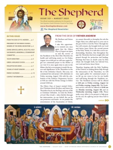 1 THE SHEPHERD • AUGUST 2025 • SAINT SPYRIDON GREEK ORTHODOX CHURCH OF SAN DIEGO continues 8 www.theshepherdnews.com The Shepherd Newsletter The official newsletter publication for the parish of Saint Spyridon Greek Orthodox Church of San Diego I S S U E 3 5 1 • AU G U S T 2 0 2 5 IN THIS ISSUE FROM THE DESK OF FR. ANDREW ...... p. 1 PRESIDENT OF THE PARISH COUNCIL, WOMEN OF THE WORD, BOOKSTORE .p. 2 DIVINE SERVICES, BIRTHS, ACOLYTES, HOLY SACRAMENTS, MEMORIALS, STEWARDSHIP COMMITTEE .............................................. p. 3 YOUTH MINISTRIES ................................. p. 4 GREEK LANGUAGE SCHOOL ................ p. 6 PHILOPTOCHOS NEWS .......................... p. 7 YOUNG AT HEART SENIORS ................. p. 9 PARISH CALENDAR ................................. p. 10 CONTACT INFORMATION....................... p. 12 FROM THE DESK OF FATHER ANDREW My Brothers and Sisters in Christ, I take this opportuni- ty to remind you once again that the Fifteen Days of August are upon us and the service of the Paraklesis to the Most Holy Theotokos for health and well-being awaits us. On Friday, August 1st at 6:00 pm we will once again be- gin our communal prayer to the Mother of our God . It is once again time to join in the fifteen-day fast as we prepare to mark the sea- son and significance of the Theotokos in the life of the Orthodox Church. This year, our communal fast and prayer will culminate on Friday morning, August 15th with the cele- bration of the Orthros/ Preparatory Service at 9:00 am with the Divine Liturgy to follow around 10:00 am. The Fifteen Days of August remind Ortho- dox Christians about the place and honor the Theotokos has in our theology and way of life as Christian Orthodox. As truly the Mother of God ( Theo [God] + tókos [birth]) through her intercessions, on our behalf, she can be our protectress and healer . As we ponder the awesomeness of the Incarnation of Christ, we cannot discredit or downplay the role the Virgin Mary was called upon to carry out as she gave birth to God the Word . Through her free will consent, she brought forth our Lord and Savior Jesus Christ, the second person of the Holy Trinity. It is with this correct un- derstanding, therefore, that throughout the ages the Theotokos has been sought after and prayed through for protection and healing, blessings that have no doubt come by Him whom she brought forth, her beloved Son, our Lord and Savior Jesus Christ. Therefore, keeping with the Holy Tradition of the Church, in seeking divine help through the intercession of the Theotokos, we will once again gather for communal prayer as we lift up our voices to her for our health and well-being through the Paraklesis ser- vice. The Paraklesis services will be offered at 6:00 pm on Friday evening, August 1st and Friday evening, August 8th. The Parak- lesis service will also be offered at 10:00 am on Monday morning, August 4th and on Wednesday morning, August 13th. Please make every effort to be present to help pray for the sick, the suffering and for those held in captivity.